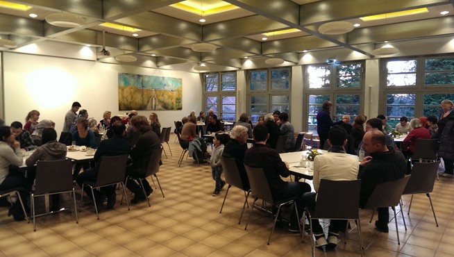 Die katholische Pfarrgemeine der Weingartenkirche hat am 23.01.2016 zum zweiten Treffen mit Flüchtlingsfamilien eingeladen. Bei Kaffee, Tee und Kuchen trafen sich rund 60 Personen. Etwa die Hälfte waren Flüchtlinge aus sieben Familien, die im Gasthaus Sonne, im Flüchtlingsheim am Flugplatz und in einer Wohnung in Zell-Weierbach wohnen. Es wurden Bekanntschaften aus dem ersten Treffen vom 12.12.2015 vertieft und neue geschlossen. Dekan Matthias Bürkle war da, viele Gemeindemitglieder sowie Paten/innen und Aktive der Flüchtlingshilfe Rebland …